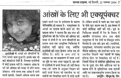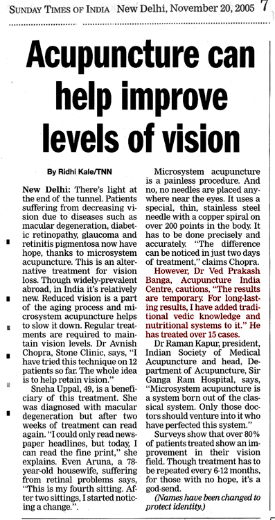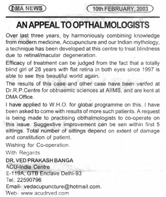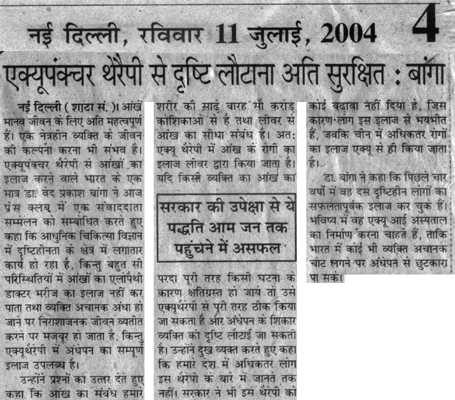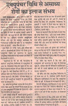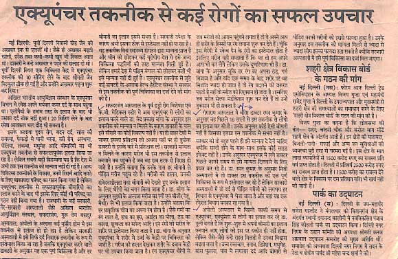 Sneh Jain an East Delhi resident, had allergy to news paper ink. She had bouts of cough, sneezing and some times bleeding, while reading a newspaper. Doctors in modern medicine had adviced her to avoid reading newspaper. But she was treated at a acupuncture centre in East Delhi, and after 10 sittings, she became all right and started reading news papers. Ramesh consulted AIIMS for severe backache but was not relieved. After 20 sittings of acupuncture, he can now run. Besides these ailment like angina, asthma, penumotnorax, gynecology problems, jaundice, paralysis, diabetes respond well to acupuncture. But the system has not been recognized by the Central Govt.