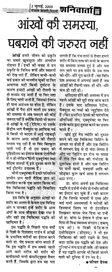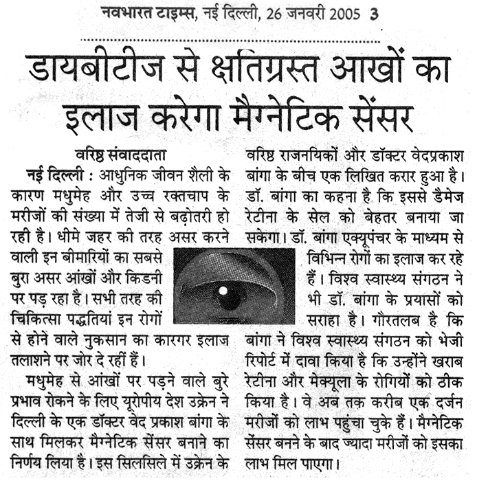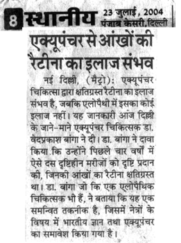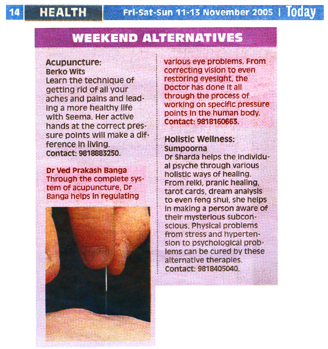 at the AIIMS and Guru Teg Bahadur Hospital. etc. But in government hospitals generally, it has been reduced to a simple pain alleviating technique. But, according to acupuncture reports, this is a complete technique and every disease responds to it. It is only due to government apathy that it has not been utilized. This system has been recognized by the W.H.O. and many European Countries, besides China. In our country, West Bengal has recognized this system. A former resident doctor at Safdarjang Hospital New Delhi and acupuncture practitioner at K.G. Medical Centre. Dr. V.P. Banga says that it is very difficult to learn the system due to absence of its recognition. There are only two options to learn it-by going abroad or from doctors practising in India. A patient reaches an acupuncture practitioner only when he finds no hope anywhere else. He says that all types of patients are coming to him. Choice of treatment is made after assessing the patient's conditions, sensitivity and status of |